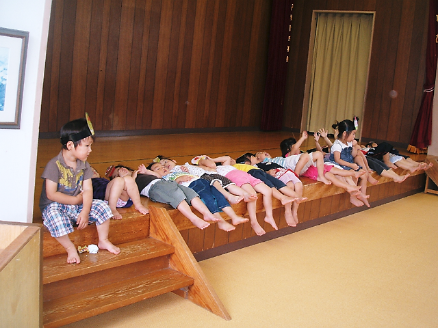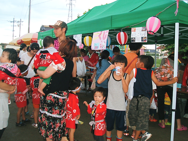 保育園の一大イベントの納涼大会。開始の少し前にすごい夕立が降ってしまいましたけど、保護者会の役員さん・実行委員さんたちや有志のお父さん方のご協力のもと屋外で開催することができました。(*^_^*)たくさんの夜店、影絵、花火・・・そしてきりん組のげんきな和太鼓にあわせての踊り、楽しかったね!みんな、ハッピ姿、かっこよかったね!