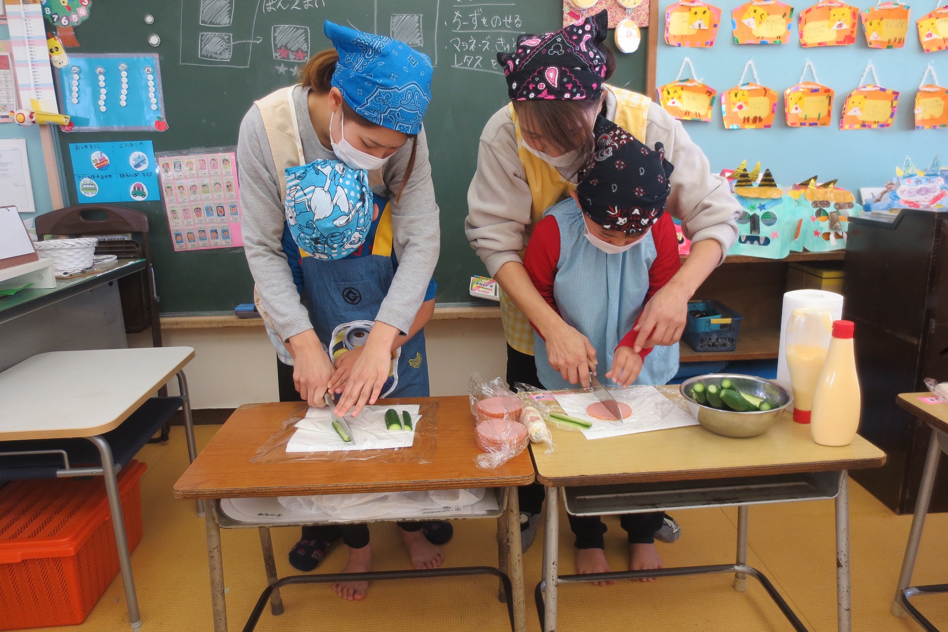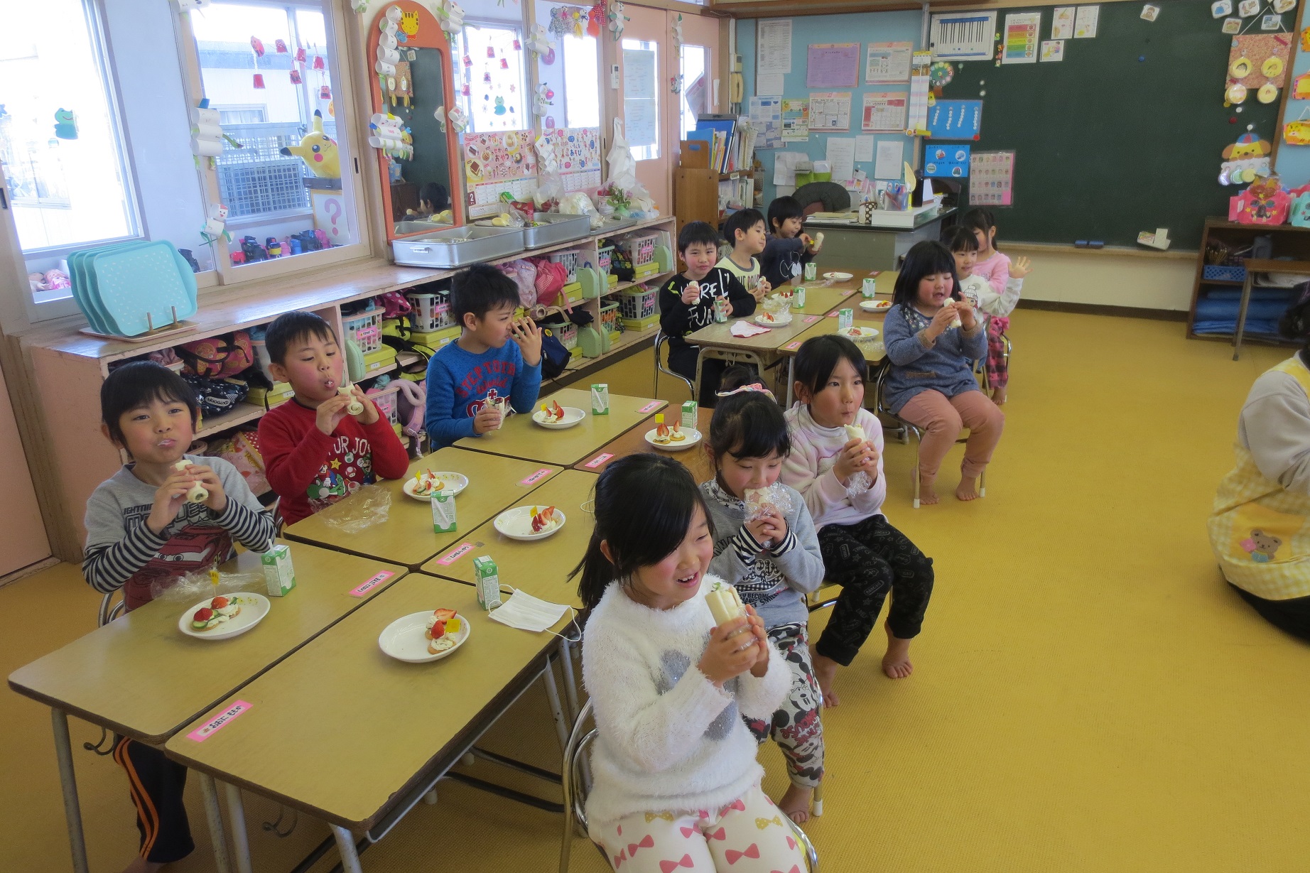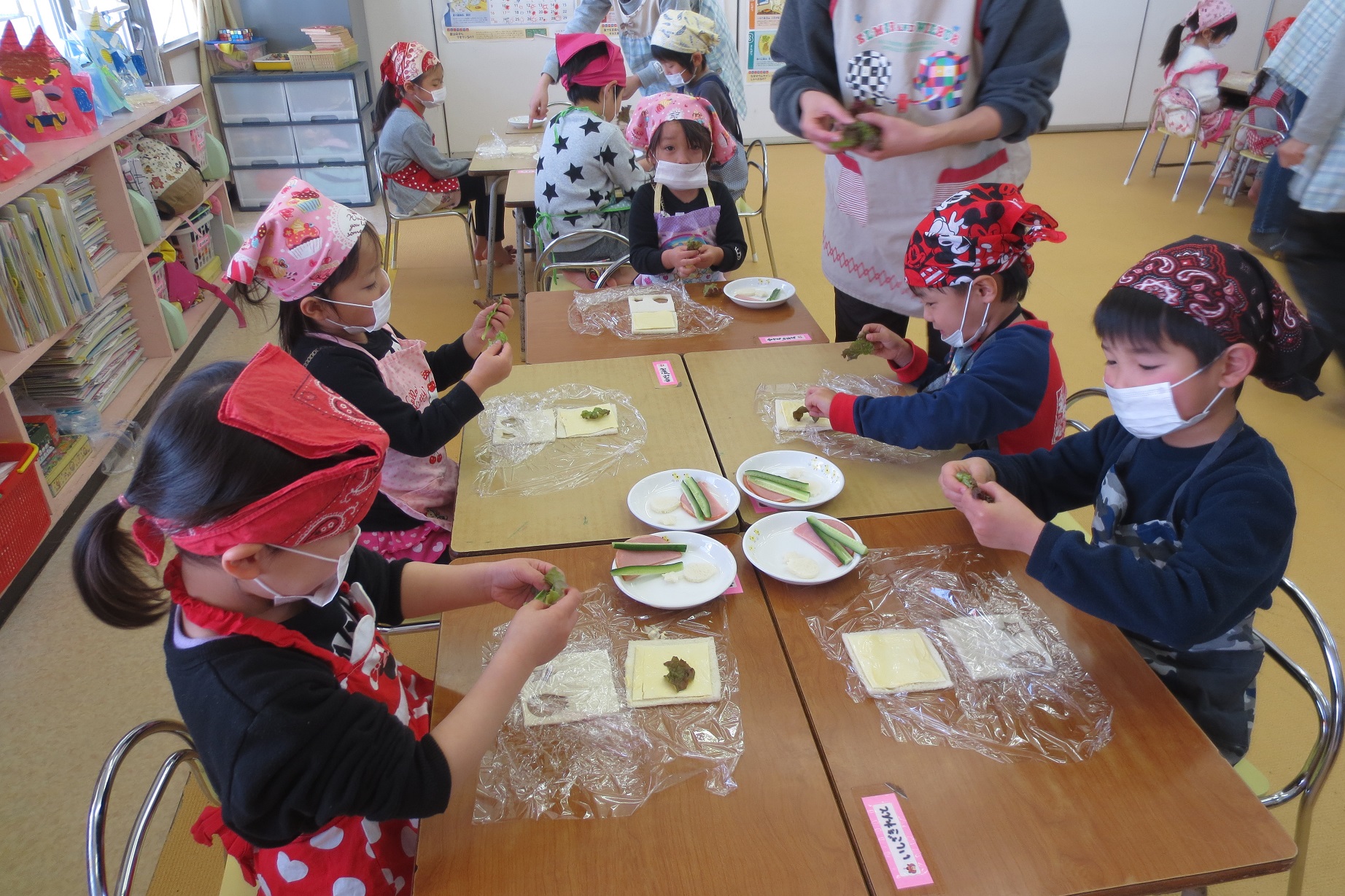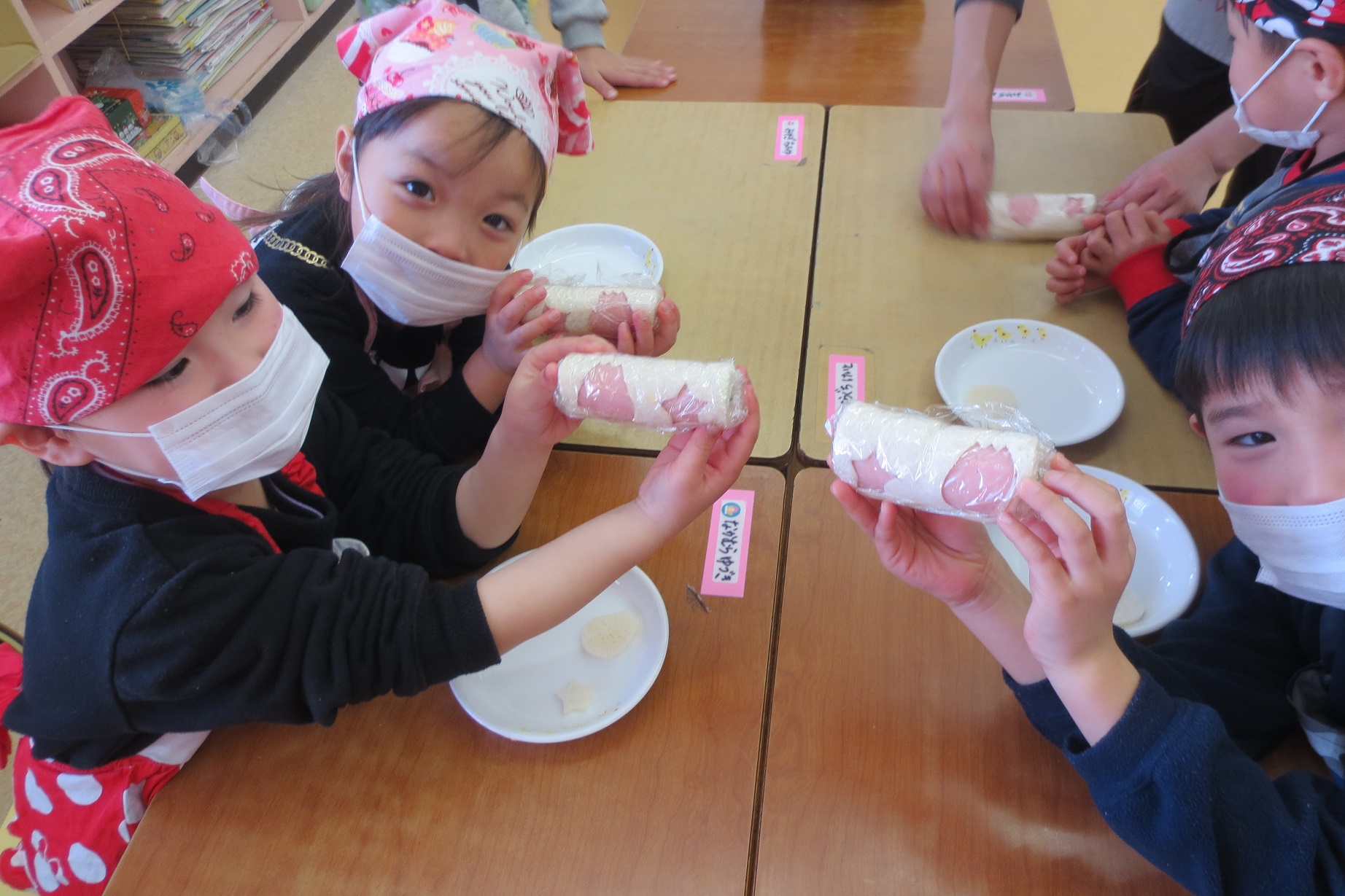 前日にきりん組は、クッキング保育で恵方巻サンドを作りました。切ったり、混ぜたり、、丸めたり、楽しくクッキングしました。そして今年の恵方南南東を向いて無言でかぶりつきました。